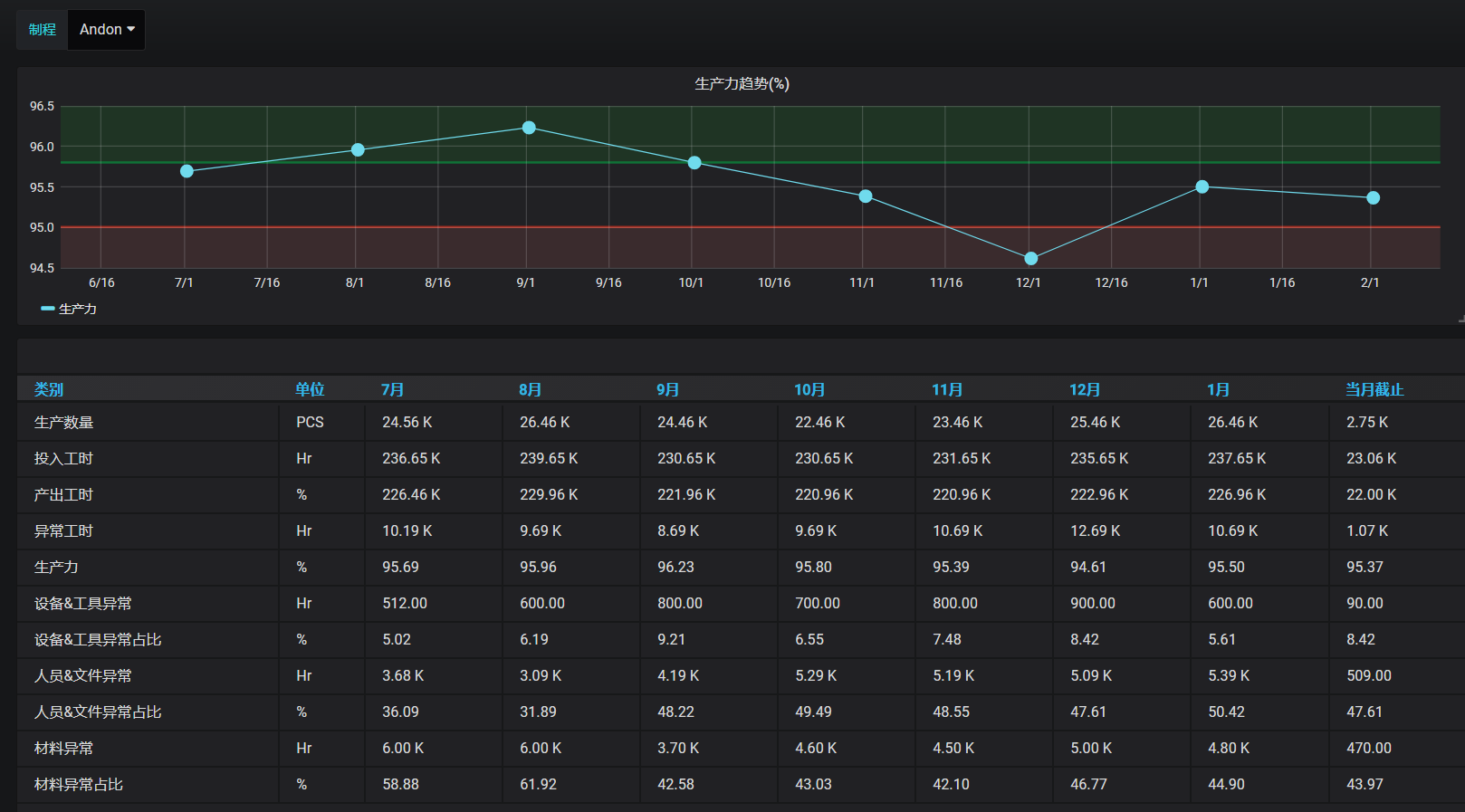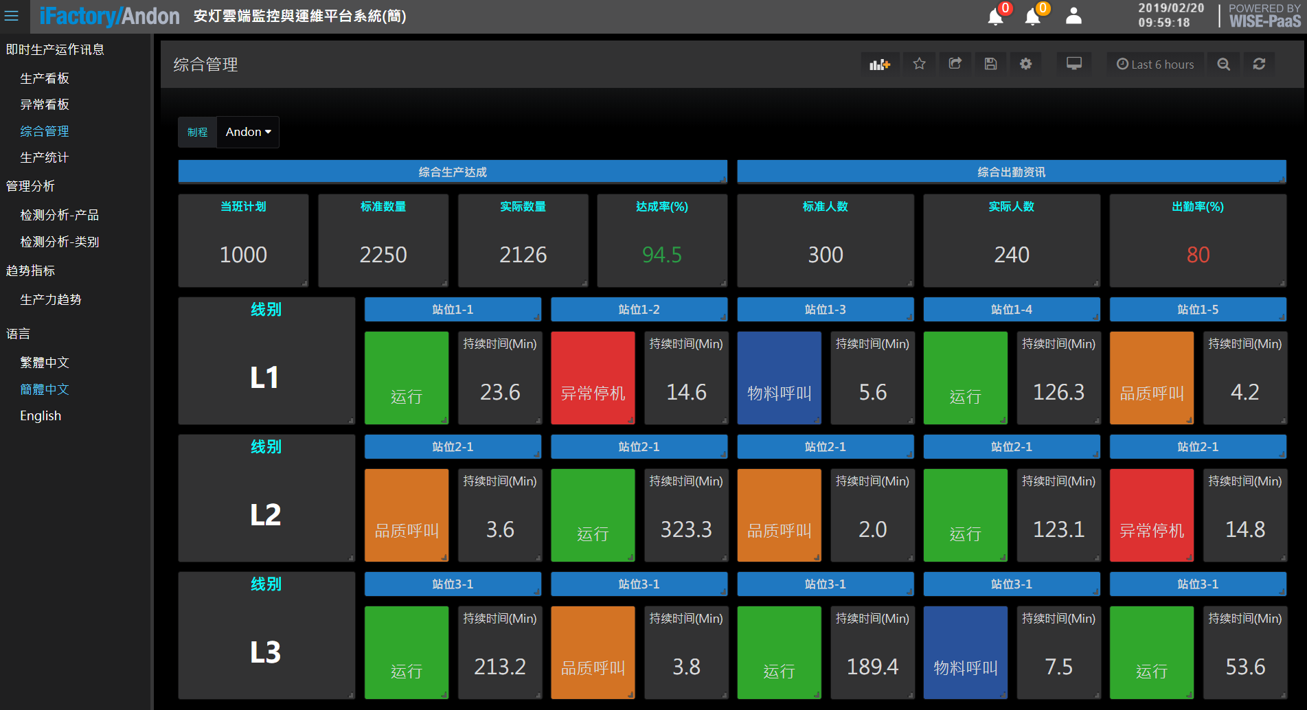 然而现今在工业快速发展信息化,现场安灯的使用已经延伸到战情室的数据分析可视化,让管理层也可以实时掌握现场设备、人员、效率等资讯,实现透明化管理。研华“安灯系统可视化方案”最大的特点在于内建的数据分析仪表板呈现,只要链接数据采集层,即可轻松实现数据可视化,无需再经过繁琐又复杂的软件设置程序或是高度客制化的页面。基于HTML5开发的战情室画面提供浏览网页方式远程实时监控现场各条生产线和各个岗位的状态,将现场目视化功能拓展到互联网。再者,画面清楚的展现现场异常状态的分门别类和统计频率,工位瓶颈站提示、生产力趋势信息等,简洁直观的页面呈现聚焦重点,让管理层快速掌握主要资讯做出对应决策。